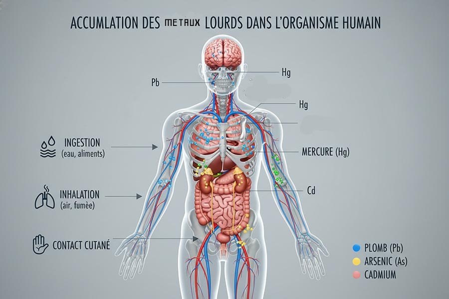 Les métaux lourds perturbent le fonctionnement cellulaire, les systèmes enzymatiques et s’accumulent dans les organes où ils déclenchent une inflammation et un stress oxydatif. Les dommages affectent de nombreux systèmes de l’organisme, du cerveau et du cœur aux reins et au tube digestif.